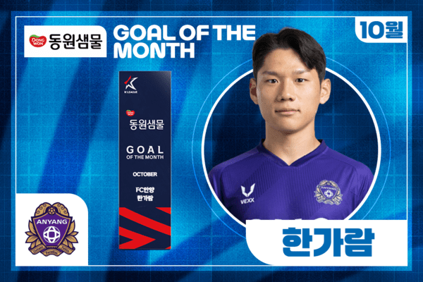 안양 한가람이 2025시즌 10월 K리그 '안심을 마시다 동원샘물 이달의 골' 수상자로 선정됐다.