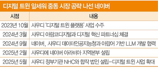 근거 없는 자신감은 아니다. 네이버는 중동 시장을 중심으로 디지털 트윈 수주를 진행 중이다. 네이버는 2023년 10월 사우디아라비아 자치행정주택부에서 디지털 트윈 플랫폼 구축 사업을 수주했다. 지난 5월에는 사우디 주택공사(NHC)와 전략사업법인 네이버이노베이션을 설립해 디지털 트윈 플랫폼 사업 범위를 사우디 전역으로 확장했다. 당시 NHC는 홈페이지를 통해 합작 법인이 진행할 사업 규모를 20억리얄(약 8000억원)로 제시했다.