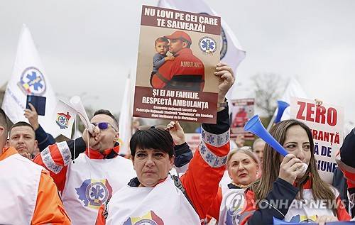 epa12520509 National Ambulance Trade Union Federation members wave placards and blow plastic trumpets during a trade union confederation protest in Bucharest, Romania, 12 November 2025. Up to 5.000 trade unionists from across the country, organized by National Trade Union Bloc (BNS) trade union confederation, participated in a protest in the Romanian capital today against the budget austerity measures taken by the Bolojan cabinet. Trade unionists demand indexation of salaries to the inflation rate, but also more respect for workers, whether it's county ambulance services, local public transport, those who work at the Railways or at Romanian Waters. The rally began in front of the government headquarters and then the unionists marched through the Bucharest downtown protesting in front of the Ministries of Economy, Labor, Internal Affairs, Health, Energy, Justice, and Finance. The central placard reads: 'DON'T HIT THOSE WHO SAVE YOU! THEY HAVE FAMILIES TOO. RESPECT THE AMBULANCE!'. EPA/ROBERT GHEMENT