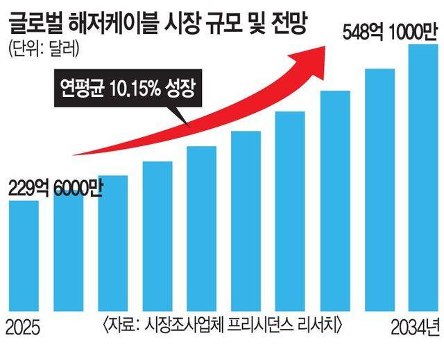 막대한 전력을 빨아들이는 AI 데이터센터 역시 해저케이블 수요를 밀어올리는 요인이다. 시장조사기관 프리시던스 리서치는 세계 해저케이블 시장 규모가 올해 229억 6000만달러(약 32조)에서 2034년 548억 1000만 달러(약 77조)로 성장할 것이라고 전망했다. 업계 관계자는 “오래된 해저케이블의 교체 시기와 재생에너지·AI 발전 시기가 겹치면서 공급이 수요를 따라가지 못하는 상황”이라며 “해저케이블 전력망은 국가 기반 산업인데다 한번 설치하면 수십년간 사용해야 하기 때문에 기술 장벽이 높다”고 말했다.