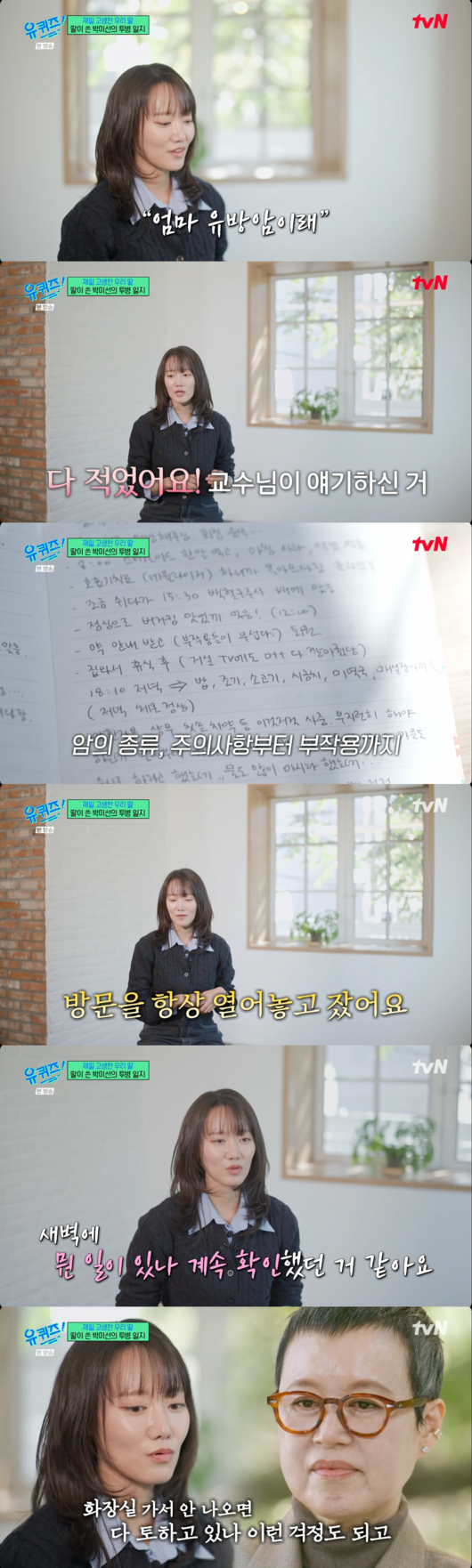 [OSEN=박근희 기자] '유 퀴즈 온 더 블럭’ 개그우먼 박미선의 딸이 어머니의 유방암 투병 기간 동안 겪었던 심경과 헌신적인 간병 비하인드를 털어놓았다.