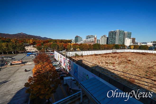 | ▲ 11월 10일 오후 서울 종로구 세운4구역 도시정비형 재개발사업 공사현장(사진 오른쪽). 사진 위쪽으로 종묘 입구가 보인다. |
