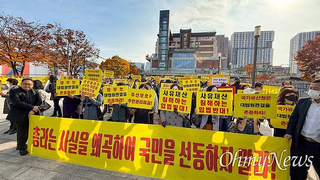 | ▲ 국가유산청과 국무총리 규탄하는 세운4구역 토지주들 11일 오후 서울 종로구 종묘 맞은편 다시세운광장에서 세운4구역 토지주들과 관계자들이 기자회견을 열고 ‘세운4구역은 2017년 1월 문화재심의 대상에서 제외되었고, 세계유산으로 지정된 종묘 정전에 600m 이상 떨어져 있어 세계유산보호 완충구역(문화유산으로부터 500미터 이내)에 해당하지 않음에도, 국가유산청 등은 유네스코를 빙자해 맹목적인 높이규제를 외치고 있다’며 ‘국가유산청 등이 재개발을 불가능하게 한다면 손해배상 및 직권남용 등 민형사상의 책임을 물을 것’이라고 밝혔다. |