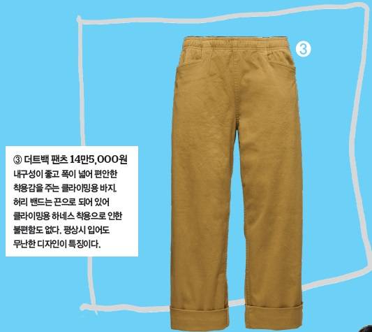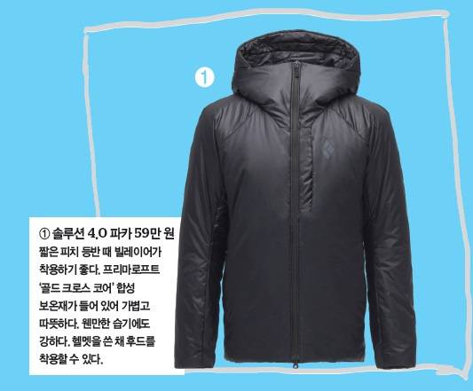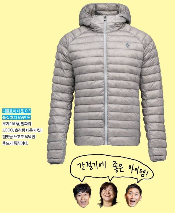 "11월 산에서 날씨는 덥고 춥습니다. 기온이 극과 극을 오가죠. 바위에 붙어 등반하는 사람은 더울 것이고, 아래서 파트너를 보고 있는 빌레이어는 추울 수 있죠. 두꺼운 우모복보다 합성 충전재인 '프리마로프트'가 들어간 재킷을 입는 것이 좋습니다. 가볍고 따뜻한 한편 습기에도 강하죠. 늦가을 배낭에 넣고 다니기에 딱이에요."