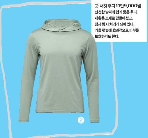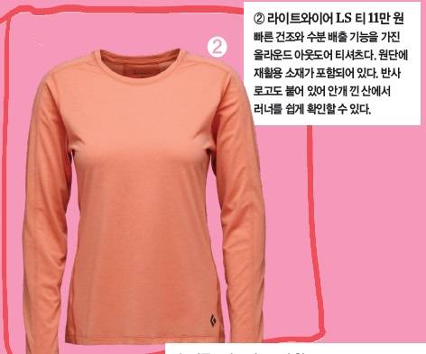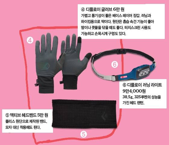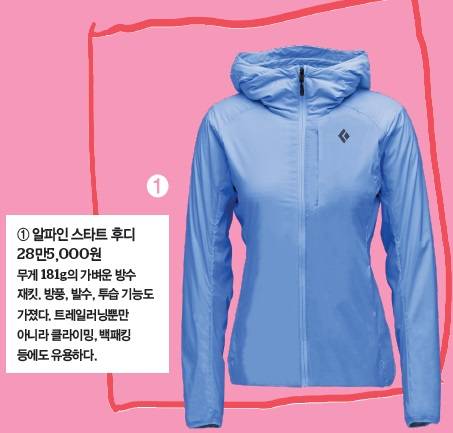 "아침 저녁으로 쌀쌀함이 느껴지는 계절이에요. 이때 산은 더 추울 수 있죠. 안개에 둘러싸여 빗방울이 떨어질 수도 있고요. 얇은 바람막이보다 좀더 두꺼운 방수재킷을 입고 뛰는 걸 추천해요. 물론 가볍고 방수 성능을 웬만큼 갖춘 것을 추천합니다. 소매에 'BD Dry'라고 적힌 것이면 충분해요."