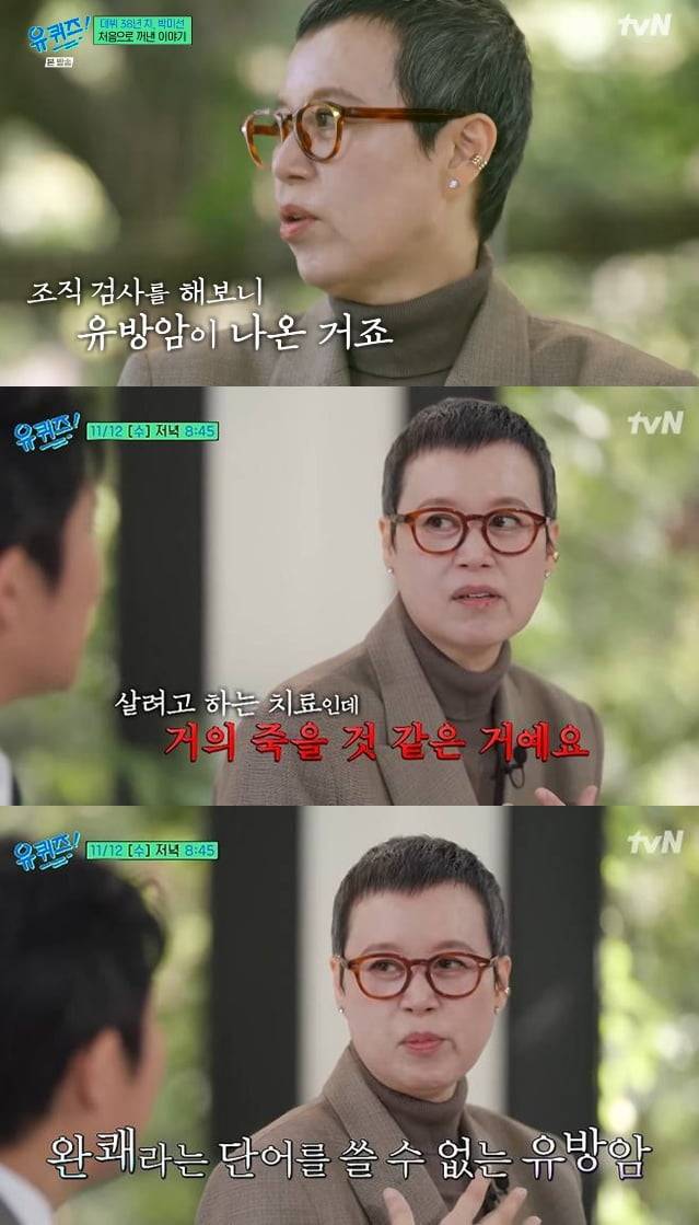 지난 12일 방송된 tvN 예능 '유퀴즈 온 더 블록'에는 박미선이 출연했다. 그는 유방암 진단 후 지난 1월 부터 모든 방송을 중단, 약 1년 만에 방송을 통해 복귀했다.