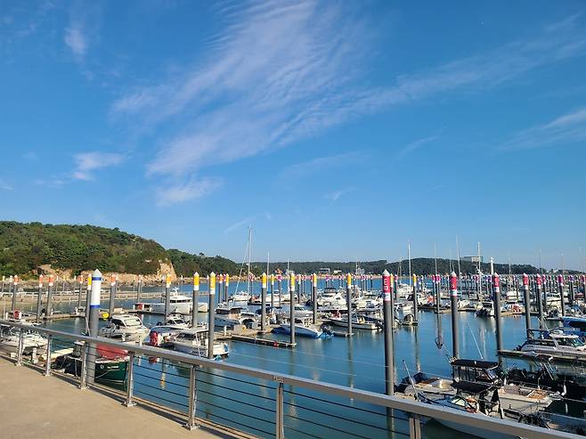 푸른 바다 위로 드넓게 펼쳐진 왕산마리나 요트 체험장이 이국적으로 다가왔다. 수많은 요트 중에 우리의 낭만을 담아 마음에 드는 요트를 골라 타보는 상상을 내 마음대로 즐겨 보았다. 푸른 바다, 하얀 돛, 기분 좋은 흔들림, 여기에 신비한 노을까지! 오늘의 일몰 예정 시각 5시 20분을 염두하며 환상의 모습을 기대했다.