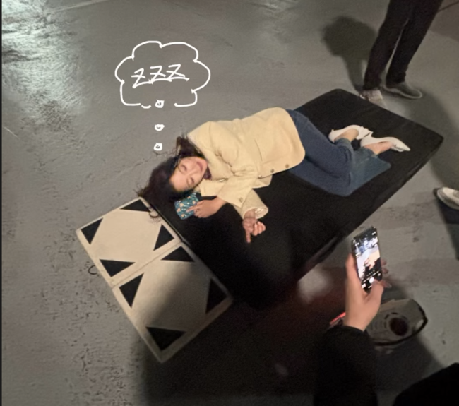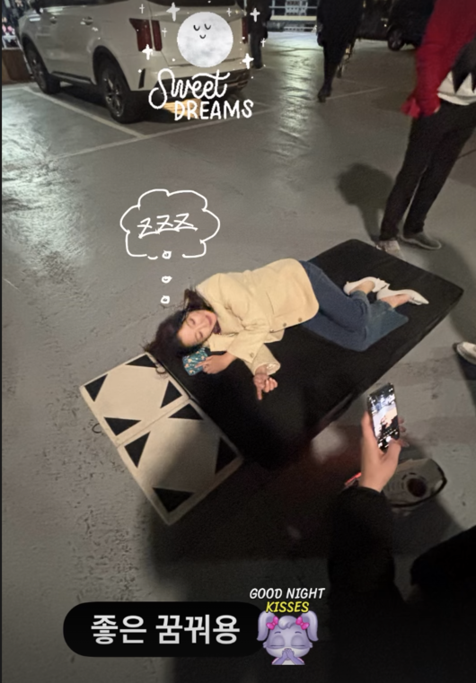공개된 사진 속 김희선은 촬영장으로 보이는 주차장에 놓인 간이 테이블(혹은 구조물) 위에 편안하게 누워 깊은 잠에 빠져 있다.