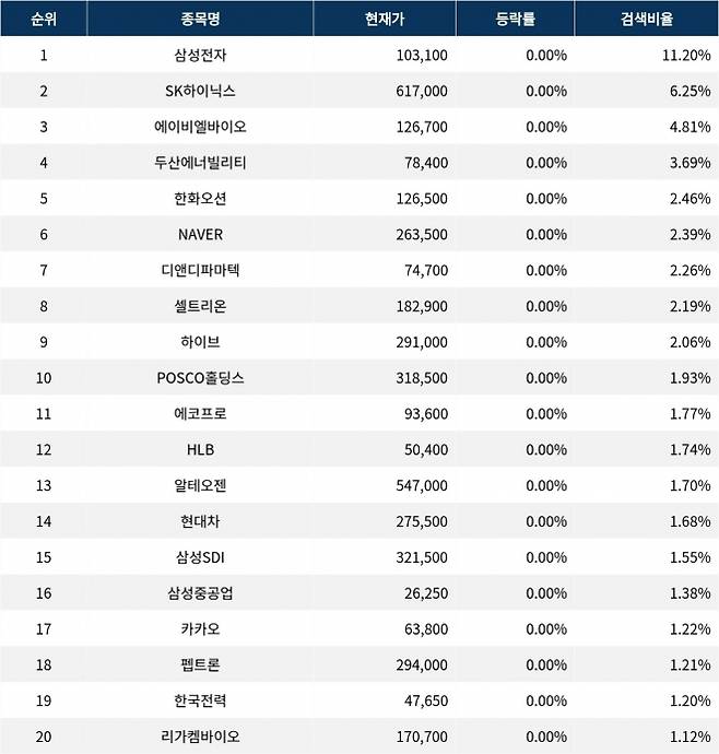 이어 SK하이닉스(000660)가 검색비율 2위를 기록하며 0.00%의 보합세를 기록하고 있다. 검색비율 3위의 에이비엘바이오(298380)는 0.00% 보합세를 보이고 있다. 검색비율 4위 두산에너빌리티(034020)는 개장 초반부터 0.00%의 보합세를 나타내고 있다. 검색비율 5위 한화오션(042660)도 0.00%의 보합세를 유지하고 있다.