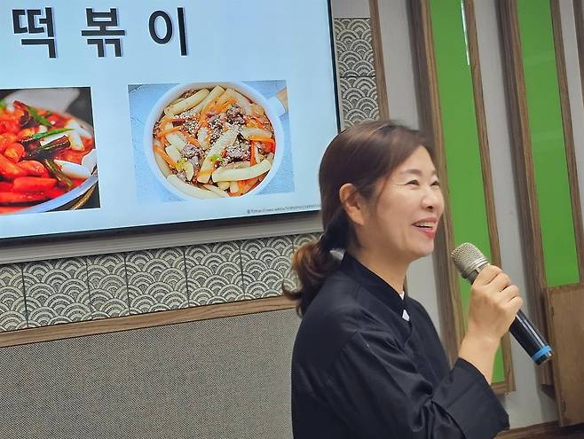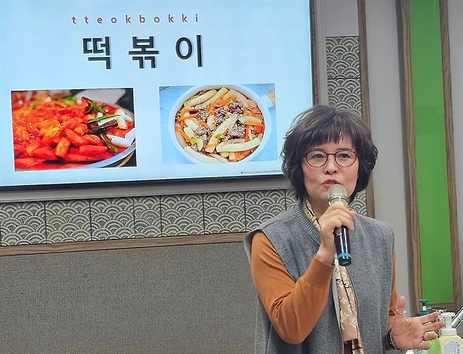 | ▲ 떡볶이 시식회 평가를 위해 참석한 전주대학교 조리식품산업학과에서 석사과정을 마친 최미라 강사가 참석 주민들에게 떡볶이의 역사 등에 설명하고 있다. |