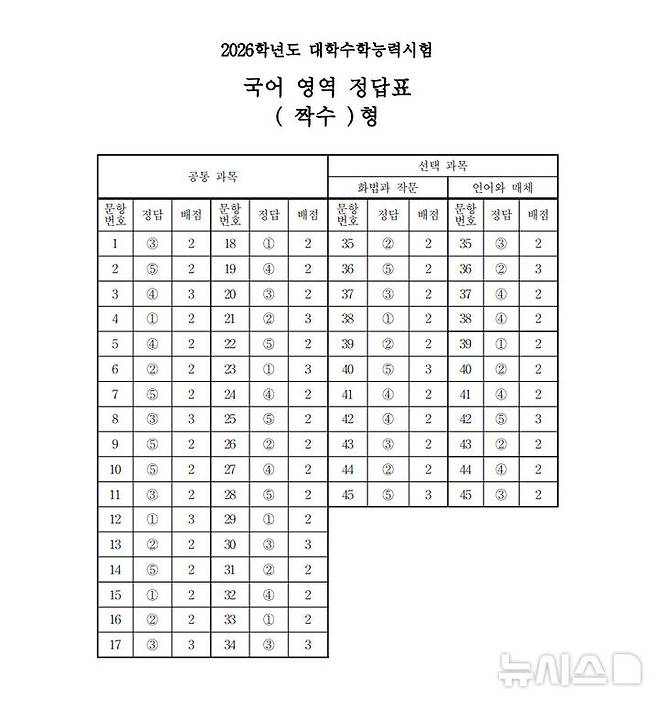 2026학년도 대학수학능력시험 국어영역 정답표 짝수형 정답표. (한국교육과정평가원 제공)