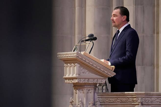 [워싱턴=AP/뉴시스] 배우 리어나도 디캐프리오가 12일(현지 시간) 미국 워싱턴 국립 대성당에서 열린 동물학자이자 환경보호 활동가 제인 구달 박사 추도식에서 추도사를 하고 있다. 디캐프리오는 "우리 모두 아름다운 자연을 보호할 책임이 있다는 구달 박사의 신념을 이어받아 고인을 기리기를 바란다"라고 말했다. '침팬지의 어머니' 구달 박사는 지난달 1일 91세의 나이로 타계했다. 2025.11.13.