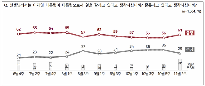 여론조사 기관 엠브레인퍼블릭·케이스탯리서치·코리아리서치·한국리서치가 지난 10~12일 성인 1004명을 대상으로 진행한 전국지표조사(NBS) 결과 ‘이 대통령이 대통령으로서 일을 잘하고 있다고 생각하는가’라는 질문에 ‘잘하고 있다’는 답변은 61%로 집계됐다. ‘잘못하고 있다’는 답변은 29%였다.