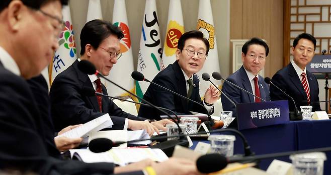 | 李정부 첫 중앙지방협력회의 개최 이재명 대통령이 12일 서울 용산 대통령실 청사에서 열린 중앙지방협력회의에서 발언하고 있다. 이 대통령은 이날 “우리 정부는 지역이 성장의 중심이 되도록 지방 우선, 지방 우대 원칙을 명확히 하고 있다”고 강조했다. 오른쪽부터 오세훈 서울시장, 유정복 인천시장, 이 대통령, 김민석 국무총리. 뉴시스 |