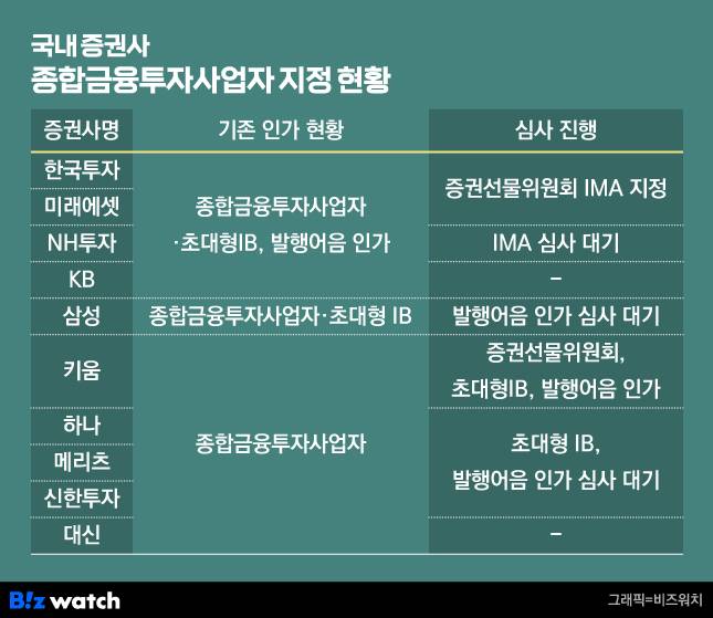 정부가 생산적 금융의 일환으로 종투사 역할 확대를 강조하고 있는 가운데 업계에서는 추가로 몇 군데에 인가를 내줄지 관심있게 지켜보고 있다. 금융당국은 제재 리스크가 있는 증권사에 대해서도 우선 심사 실무를 병행할 방침이다.