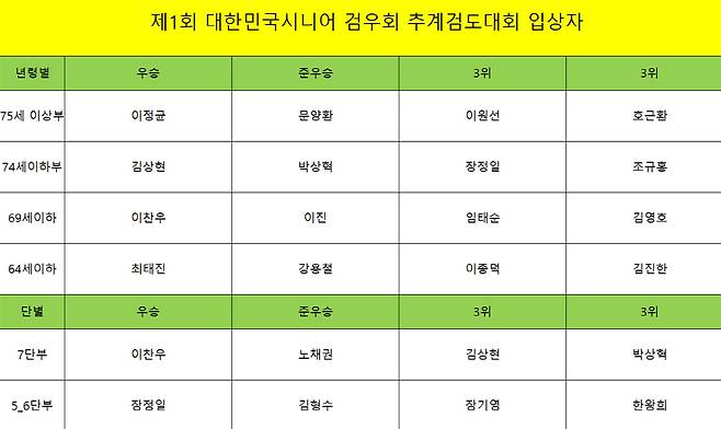 대회는 이정수 심판장(8단 범사)의 지도 하에 각 연령대 별, 단 별로 나뉘어 3분 간 단심, 단판승부 토너먼트식으로 진행됐다. 1965년생 이상 시니어 검도인들이 참가한 이번 대회에는 1950년생 이상 고령의 노장 검도인도 5명이나 참가해 '평생검도'의 의미를 되새겼다.