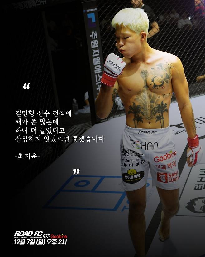 “(직전 경기인 장현진전에서) 멋진 승리를 따낸 선수라 다시 만날 수도 있겠다 예상은 했다. 그래서 어떻게 싸워야 할지 미리 생각해보기도 했다"면서 "최지운과 아마추어 때 싸워 이겼기에 자신도 있다. (다만) 그때와는 다른 선수라 생각하고 도발을 별로 안 좋아하지만 이 말은 꼭 남기고 싶다. 내가 그냥 이긴다”며 승리를 자신했다.