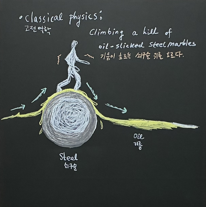 그는 설명할 수 없는 것을 사유하려는 갈망에서 출발해 그 과정을 역설적인 공식과 시각적 언어를 통해, 칠판 연구 드로잉, 영상 그래프, 도해 작업으로 구현했다.