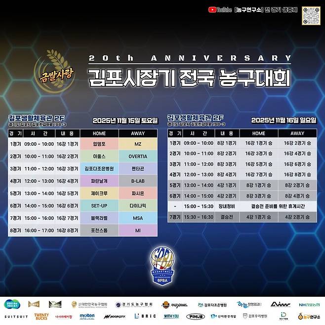 지난 8일 경기도 김포시 김포생활체육관에서 김포시농구협회(회장 구정회)가 주최하는 '제20회 김포시장기 금쌀사랑 전국생활체육 농구대회'가 개막했다. 8, 9일 예선을 마친 대회는 15일(토) 16강 본선, 16일(일) 8강을 시작해 결승전으로 마무리된다.