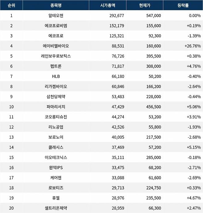 시가총액 3위부터 10위까지 종목들의 등락률은 다음과 같다. 에코프로(086520) ▼1.39%, 에이비엘바이오(298380) +26.76%, 레인보우로보틱스(277810) +0.38%, 펩트론(087010) +4.76%, HLB(028300) ▼0.40%, 리가켐바이오(141080) ▼2.64%, 삼천당제약(000250) ▼0.44%, 파마리서치(214450) +5.06%.