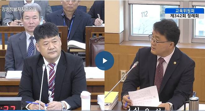 | ▲ 지난 12일 열린 강원도의회 교육위 행정사무감사에서 국민의힘 심오섭 도의원(오른쪽)이 강원도교육청 감사관(왼쪽)에게 "A교사의 발언에 대해 점검할 것"을 요구하고 있다. |