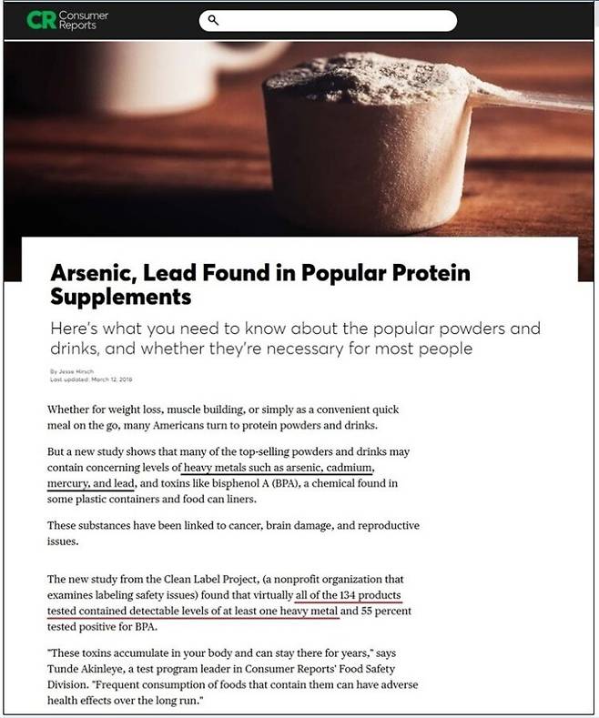더 심각한 것은 중금속 오염이다. 미국 소비자단체 '컨슈머 리포트'에서 2018년 미국 내 판매 중인 134개의 단백질 보충제에 들어있는 비소, 카드뮴, 수은, 납 등 중금속을 조사한 결과, 134개 제품 모두에서 1개 이상의 중금속이 검출되었다는 놀라운 보고를 했다. 이런 중금속들은 몸 밖으로 배출이 잘 안되어 오랫동안 몸속에 머물기에 암, 치매, 불임 등을 불러올 수 있다(아래 기사) [10].