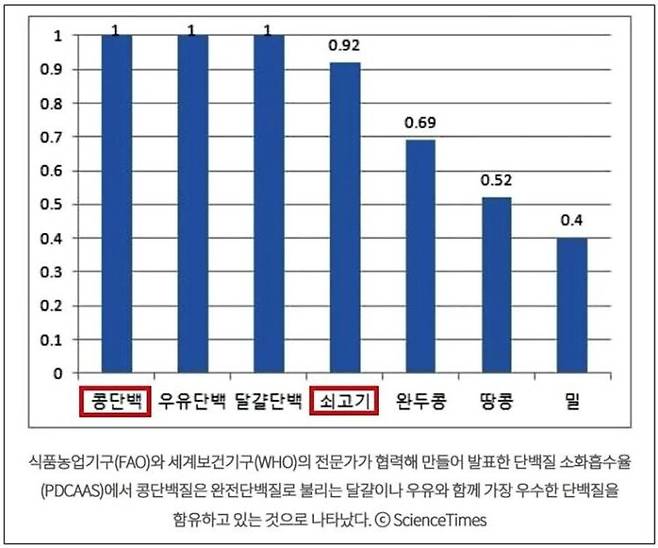 미국 식품의약청(FDA)이 단백질의 품질을 평가하는 방법으로 도입한 '단백질 소화율 보정 아미노산 점수(PDCAAS)'에 따르면 콩단백질은 완전 단백질로 불리는 우유나 계란과 함께 1점으로 가장 우수한 단백질로 판정받았다. 반면 쇠고기는 0.92점이었다 (아래 도표) [3].