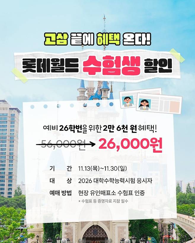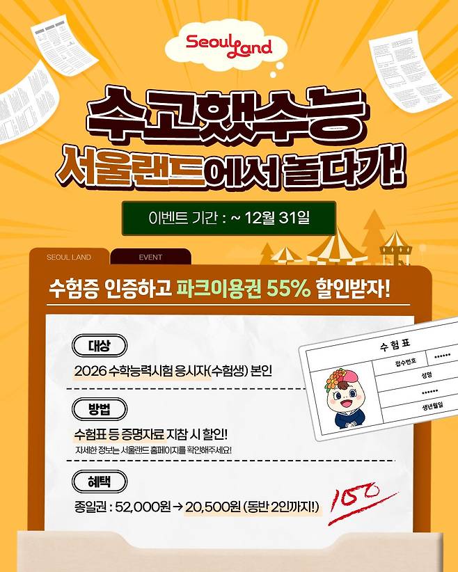수험 스트레스 해소에 테마파크만한 게 없죠. 에버랜드는 수험생 본인에 한해 연말까지 종일 이용권을 2만원에 판매합니다. 여기에, 본인 제외 최대 3인까지 종일 이용권을 3만원에 구입할 수 있는 만큼 단체 방문 수요가 높아질 것으로 예상돼요.