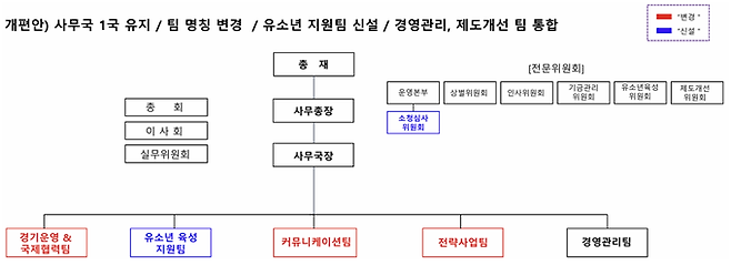 제도개선팀은 유소년 육성 지원과 주최단체지원금 관련 사업으로 분리, 주최단체지원금 관련한 업무는 경영관리팀과 통합되어 지속가능한 성장을 위한 경영 인프라 고도화와 내부 역량 강화를 더욱 체계적으로 해나갈 계획이다.