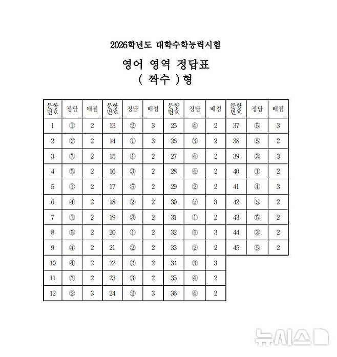 2026학년도 대학수학능력시험 영어영역 정답표 짝수형 정답표. (한국교육과정평가원 제공)