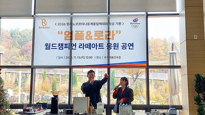 이날 공연은 오후 12시 진천 국가대표선수촌 선수식당에서 동계올림픽을 앞두고 훈련에 매진 중인 국가대표를 격려하기 위해 마련됐다. 월드라테아트챔피언십 수상자인 엄폴&로라 커플이 색다른 '라테아트 공연'을 선보였다.