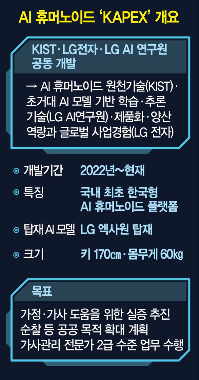 엑사원 개발 주역인 배 과학기술부총리는 케이펙스와 악수를 나누고 사진을 찍더니 LG의 역할을 콕 집어 물었다. 백승민 LG전자 로봇선행연구소장은 “(KIST로부터) 기술이전을 받아 수년 간 공동 연구소를 운영하고 제품화를 앞당길 계획”이라고 답했다. 집안에서 스스로 청소와 정리, 세탁, 식사 준비 등이 가능한 가사관리전문가 2급 수준의 기술을 확보해 가정용 AI 휴머노이드 시장부터 공략하겠다는 구상이다.