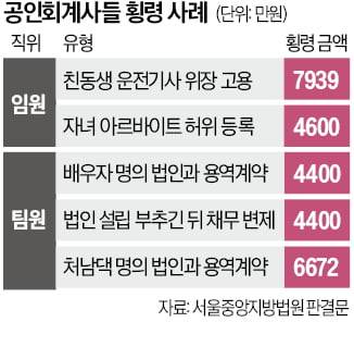 기소된 S회계법인 파트너(이사) A씨는 동생을 운전기사로 채용하는 내용의 연봉계약서를 작성한 뒤 회사에 제출해 2018년부터 5년간 7939만원을 빼돌린 혐의로 1심에서 벌금 500만원을 선고받았다. 같은 회계법인에서는 자녀가 기장 업무 아르바이트로 일하는 것으로 가장해 2020~2023년 19회에 걸쳐 4600만원의 허위 급여를 타낸 사례도 적발됐다.