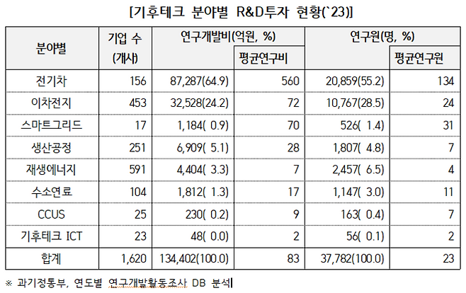 그러나 R&D가 전기차·이차전지 등 특정 분야에 집중되는 경향이 뚜렷했다. 투자 규모가 가장 큰 전기차 분야와 가장 작은 기후테크 정보통신기술(ICT) 분야를 비교한 결과, R&D 비는 1818배, 연구인력은 372배 차이를 보였다. 또 전기차·이차전지 분야가 전체 R&D 비 89%, 연구인력 84%를 차지하는 것으로 나타났다.