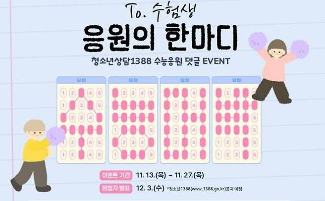 '청소년상담1388'에서는 27일까지 'To. 수험생, 응원의 한마디' 온라인 응원 이벤트도 진행된다. 수험생과 국민이 함께 SNS를 통해 응원과 위로의 메시지를 나누며 청소년들이 자신의 마음을 표현하고 필요시 청소년 상담 서비스에 연결도 한다.