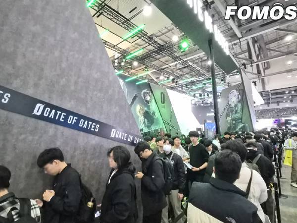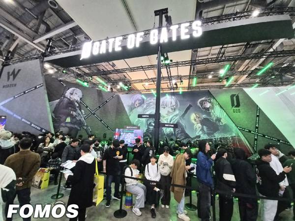 반대 면에는 신작 전략 디펜스 게임 '게이트 오브 게이츠' 시연대를 마련했다. '테르비스'와 다르게 어두운 회색 벽면에 녹색 조명으로 포스트 아포칼립스 세계관 특유의 분위기를 전달했다. 등장 캐릭터로 분한 코스튬 플레이어도 중앙 무대에 올라 몰입도를 높였다.