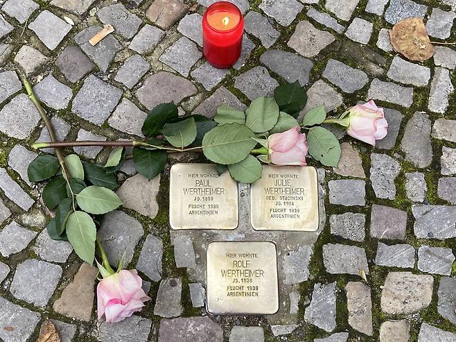 | ▲ '걸림돌'이라 불리는 보도의 황동 명판 주변에 11월 9일 이른 아침 누군가 장미와 촛불을 놓아두었다. 부모와 열 두 살짜리 아들이 끌려간 베르트하이머 가족. |
