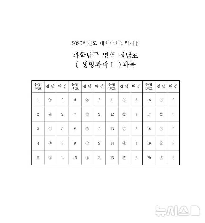 2026학년도 대학수학능력시험 과학탐구영역 정답표 생명과학Ⅰ 정답표. (한국교육과정평가원 제공)