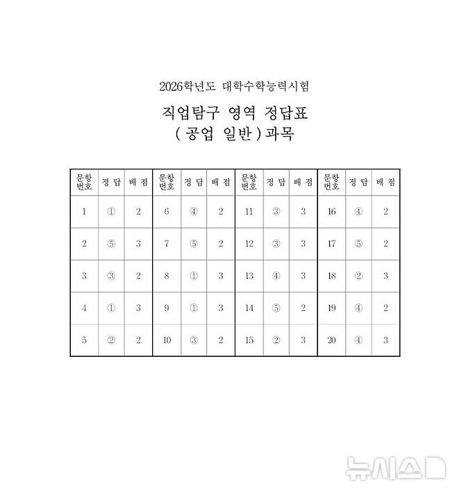 2026학년도 대학수학능력시험 직업탐구영역 정답표 공업 일반 정답표. (한국교육과정평가원 제공)