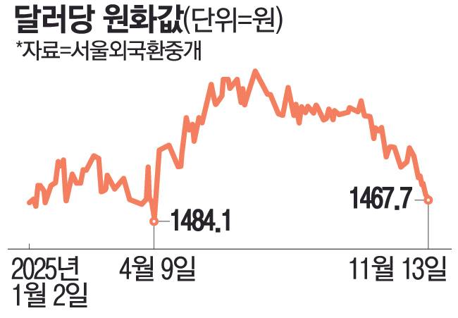 13일 서울외환시장에서 달러당 원화값은 1467.7원에 정규장을 마감했다. 오전 한때 1475.3원까지 내려가, 이틀 연속 장중 1470선을 뚫었다. 장중 기준 지난 4월 9일(1487.6원) 이후 7개월만에 가장 낮은 수치다. 서학개미의 미 증시 투자 확대와 여전한 한미 관세협상 불확실성 등은 ‘원화값 1400원대’라는 ‘뉴노멀’을 넘어 1500원 이하로도 떨어질 수도 있다고 전문가들은 진단했다. 원화값 추가 하락시 국민연금이 환헤지에 나설지에도 관심이 쏠리고 있다.