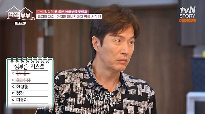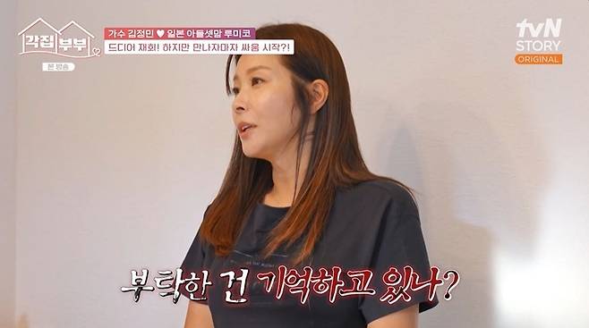 특히 루미코는 "매번 제대로 가져다준 적이 한 번도 없다"라고 토로했고, KCM은 "형이 잘못했다"라며 김정민의 잘못을 인정했다. 루미코가 정장을 부탁한 이유는 애들 학교 행사 때문이었고, "급하지 않았으면 부탁 안 하지. 일본에서 준비해서 가면 되는데"라며 "물건을 안 갖다준 게 문제가 아니라 맨날 내 얘기를 흘려듣는다. 이미 문자로도 남겼다"라고 밝혔다. 이를 본 문소리는 "각집 부부 최초 부부싸움이 일어나냐"라고 말하기도.