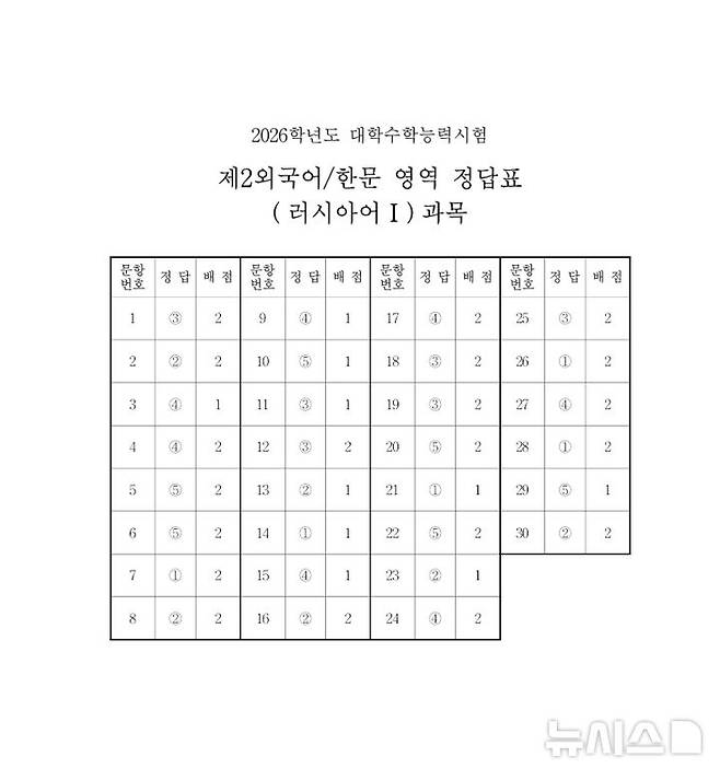 2026학년도 대학수학능력시험 제2외국어/한문영역 정답표 러시아어Ⅰ 정답표. (한국교육과정평가원 제공)