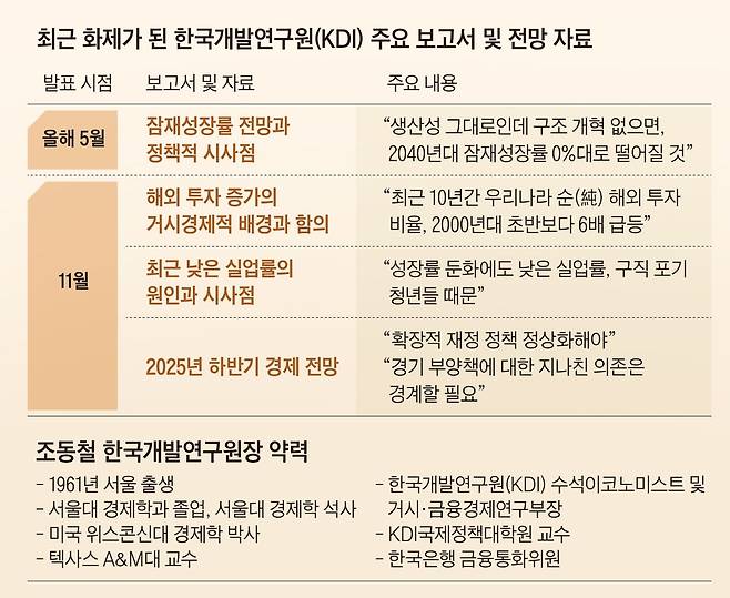 KDI 관계자는 “연간 KDI 보고서는 연구용역 등을 합쳐 300여 건에 이른다”며 “모든 보고서를 원장이 일일이 볼 수는 없고, 대부분 큰 제약 없이 연구원 소신이 담긴 내용이 나간다”고 했다. 다만 이 관계자는 “조 원장은 연구원 개인이 아닌 KDI 기관 이름으로 나가는 전망 자료나 보고서만 꼼꼼히 확인한다”고 했다.