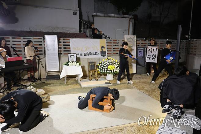 | ▲ 13일 오후 대구 중구 남산동 전태일 옛집에서 열린 55주기 추모식에서 젊은 연극인들이 전태일을 공연하고 있는 모습. |