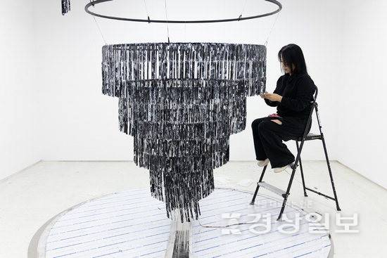 전시장 중앙의 설치작품은 전시의 축을 형성한다. 약 9000개의 검은 레이어가 수직으로 이어진 샹들리에 구조는 하늘과 땅, 기억과 망각, 생과 죽음의 방향을 동시에 가리킨다.