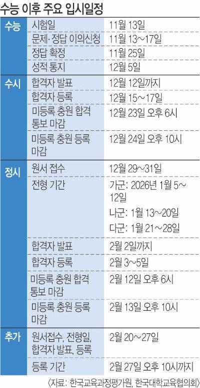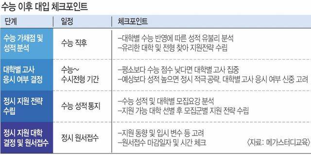 2026학년도 대학수학능력시험이 13일 마무리됐지만 대입이 끝난 것은 아니다. 수능 이후에도 빡빡한 입시 일정이 기다린다. 수능 성적 그 자체가 중요한 것은 아니므로 진학할 대학이 결정될 때까지는 긴장감을 유지할 필요가 있다. 입시 전문가들은 평소 생활 방식을 유지하면서 준비해온 대입 전략을 구체화하라고 조언한다.