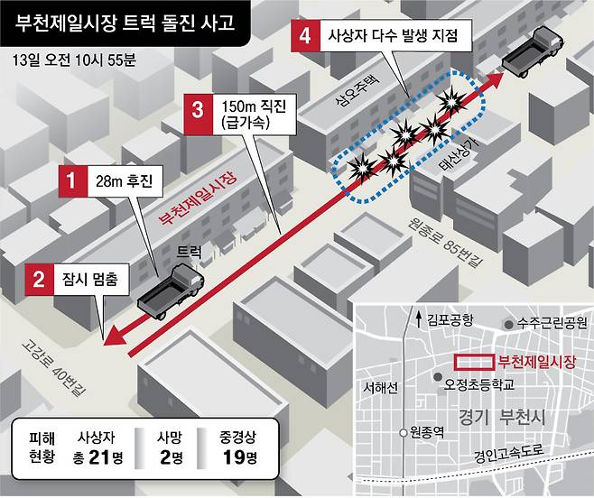 부천소방서와 부천오정경찰서에 따르면 사고는 오전 10시 55분경 발생했다. 김모 씨(67)가 몰던 1t 트럭은 물건을 내린 뒤 시장을 빠져나가기 위해 약 28m 후진했다가 멈춰 선 직후, 폭 3m 남짓한 시장 안쪽 보행로로 150m가량을 직진으로 질주했다. 김 씨는 시장 초입에서 생선 가게를 운영하는 상인으로, 이곳에서 장사한 지 20년 정도 됐다고 한다. 사고 당시에도 물건 운반을 위해 트럭을 운전한 것으로 파악됐다.