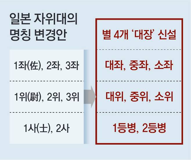 산케이신문 등에 따르면 일본은 이번 개편을 통해 ‘막료장’ 계급을 ‘대장’으로 새롭게 정하는 방안을 추진 중이다. 또 다른 나라 군대의 대령과 대위에 해당하는 ‘1좌(1佐)’와 ‘1위(1尉)’는 각각 ‘대좌’, ‘대위’로 바꾸는 방안을 검토하고 있다. 2좌와 3좌는 중좌와 소좌로, 2위와 3위는 중위와 소위로, 일반 병사인 1사와 2사는 1등병, 2등병으로 바꾸는 것을 검토 중이다.