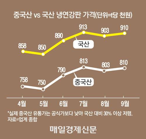 13일 철강협회 통계에 따르면 지난 9월 기준 국산 냉연강판 유통 가격은 t당 91만원, 중국산 수입재는 81만원으로 10만원의 차이를 보였다. 하지만 공식 집계와는 달리 시장에서는 중국산이 훨씬 더 저렴하게 거래되고 있다. 업계에 따르면 중국산 냉연의 CFR(운임 포함 인도 가격)은 510~520달러(t당 75만원) 수준인 반면 국내 유통가는 t당 90만원으로 20~30% 가격 차이가 나는 것으로 파악됐다.