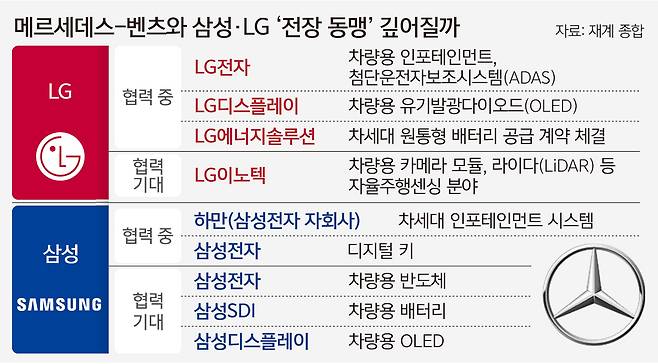 미래 먹거리의 핵심 축으로 전장(자동차 전자·전기 장비)을 택한 삼성과 LG가 글로벌 프리미엄 완성차 시장의 선두주자인 메르세데스-벤츠와의 ‘미래차 동맹’ 구축에 열을 올리고 있다. 벤츠로서도 격변하는 글로벌 공급망 변화 속에 삼성·LG가 핵심 전장 공급자로 부상한 만큼 양측의 파트너십은 강화될 것이란 분석이 나온다.